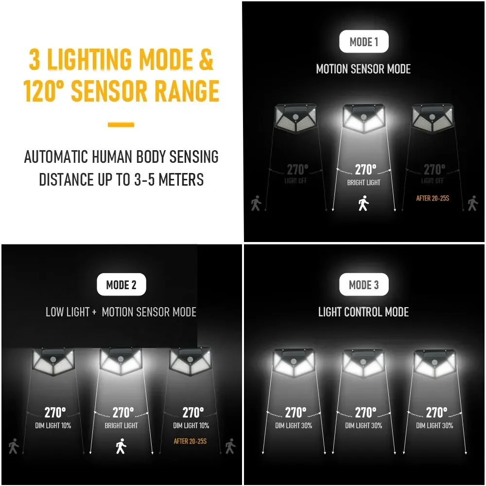 A luz solar 100 LED possui 3 modos, você pode escolher o modo perfeito de acordo com suas diversas necessidades. Modo de luz média, modo de sensor de luz fraca e modo de sensor.