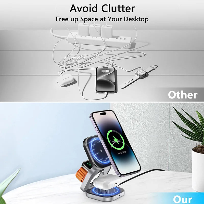 A estação de carregamento rápida Mag-Safe pode carregar simultaneamente para iPhone, iWatch e AirPods sem afetar outra velocidade de carregamento. Oferece velocidade de carregamento sem fio de até 15 W. O iWatch SE2/8/7/6/SE/5/4/3/2 (não aplicável a outros relógios) é de 2,5 W, e os AirPods 2/3 Pro 1/2 e outros fones de ouvido com suporte para carregamento sem fio são de 5W. Economize espaço e fachada o limpadores de mesa.